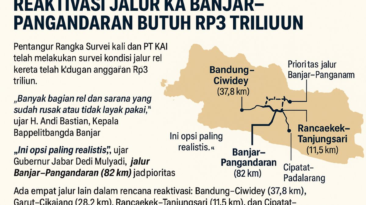 – Pemkot Banjar beserta PT Kereta Api Indonesia (KAI) sedang melaksanakan penilaian feasibilitas infrastruktur guna mendukung revitalisasi jalur kereta api antara Banjar dan Pangandaran. Rencana proyek tersebut diproyeksikan membutuhkan biaya sekitar tiga triliun rupiah.